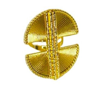 Découvrez notre bague à deux demi-cercles dorés, une pièce élégante et inspirée par des motifs ethniques africains.